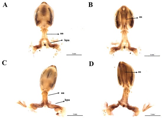 Phallus of T. rosai sp. nov.: (A) dorsal view, (B) ventral view, T. sordida: (C) dorsal view, (D) ventral view. bpa: basal plate arm, aa: articulatory apparatus, es: endosomal struts.