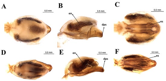 Phallus of T. rosai sp. nov.: (A) dorsal view, (B) lateral view, (C) ventral view; T. sordida: (D) dorsal view, (E) Lateral view, (F) ventral view. en: endosoma, dps: dorsal phallothecal sclerite, es: endosoma struts.