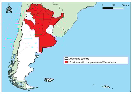 Based on Lent and Wygodzynsky [], Panzera et al. [,], Dujardin et al. []; Galvão et al. [], Calderón-Fernández and Juárez [], and Nattero et al. [], we prepared a distribution map of T. rosai sp. nov. across Argentina provinces. The map was developed in the QGIS 3.12 program [], using the layers available at the National Geographic Institute [] having the World Geodetic System 1984 (WGS 84) Coordinate Reference System as a base.