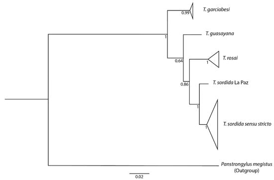 Phylogenetic analyses recovered T. rosai sp. nov. as an independent lineage of T. sordida sensu stricto and T. sordida La Paz, as well as T. garciabesi and T. guasayana, and related it as a sister taxon to T. sordida (Figure 11). Pairwise Kimura 2-parameter genetic distances for cyt b gene revealed that T. rosai sp. nov. diverges at least 8.5% from the lineages of T. sordida sensu stricto (Table 3).