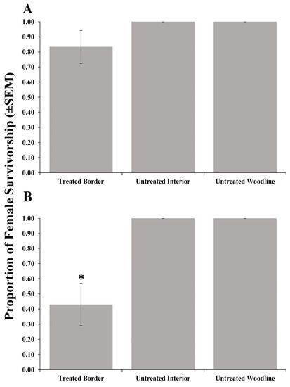 Survivorship (±SEM) of female Trissolcus japonicus provided egg masses retrieved from three apple orchard locations (border row, interior row, and untreated woodline) where the border row was treated with clothianidin (A) or bifenthrin (B) in 2018. Pairwise comparisons of female survivorship provided egg masses retrieved from the untreated woodline (control), and other egg mass deployment locations were calculated via a Dunnett’s test (p < 0.05); significant differences are indicated with an asterisk.