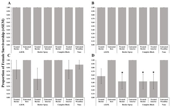 Survivorship (±SEM) of female Trissolcus japonicus provided egg masses retrieved from three apple orchard locations where a border row, alternate row middle (A.R.M.), or complete block spray pattern. Materials evaluated included methomyl (A), thiamethoxam + λ-cyhalothrin (B), clothianidin (C), or bifenthrin (D) in 2019. Pairwise comparisons of female survivorship provided egg masses retrieved from the untreated woodline (control), and other egg mass deployment locations were calculated via a Dunnett’s test (p < 0.05); significant differences are indicated with an asterisk.
