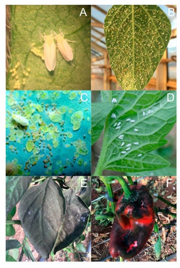 (A) Eggs and adults of Bemisia tabaci. (B) A large infestation of B. tabaci on the abaxial side of the soybean leaflet. (C) Different life stages of Bemisia tabaci colonizing and feeding on a cabbage leaf. (D) Adults of Trialeurodes vaporariorum feeding on the abaxial side of a tomato leaf. (E,F) Sooty mold covering sweet pepper leaves and fruits.