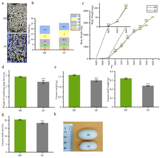 We also measured and compared the cocoon, cocoon shell and the cocoon shell rates of both groups. The cocoon weights for MF were heavier than those for AF. The cocoon shell weights were 0.32 g and 0.24 g for MF and AF, respectively. The cocoon shell ratio for MF was 20.32%, which was 12% higher than that for AF (18.13%). Hence, the mulberry leaf diet resulted in relatively higher cocoon production (Figure 1e–g) and the cocoons in AF were smaller than those in MF (Figure 1h).