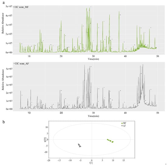 Relative gas chromatography-mass spectrometry (GC-MS) base peak intensity ion chromatograms (TICs) (a) and orthogonal partial least squares discriminant analysis (OPLS-DA) for feces of mulberry leaf group (MF) and artificial diet group (AF) (b). MF and AF are the fecal samples from larvae reared on fresh mulberry leaf and artificial diet, respectively. MF, n = 6 replicates; AF, n = 6 replicates.