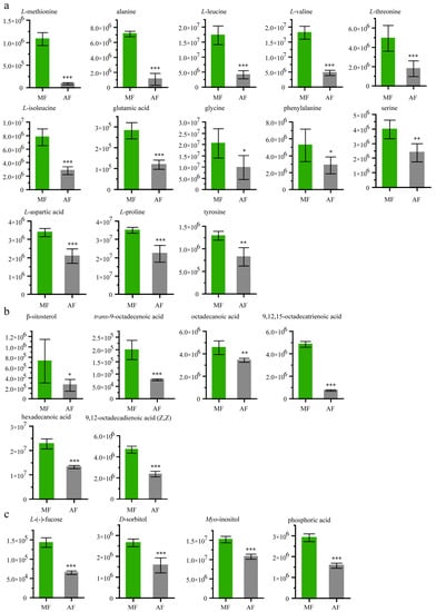 The abundances of six different lipids (9,12,15-octadecatrienoic acid, β-sitosterol, trans-9-octadecenoic acid, 9,12-octadecadienoic acid (Z,Z), hexadecenoic acid, octadecanoic acid) were greater by 6.51-fold, 2.78-fold, 2.56-fold, 1.99-fold, 1.72-fold and 1.32-fold, respectively, in the MF feces than in the AF feces. (Figure 3b). The levels of L-(−)-fucose (t value: −14.04; degree freedom: 6; p value: 8 × 10−6), D-sorbitol (t value: −6.63; degree freedom: 7; p value: 0.0003), myo-inositol (t value: −10.44; degree freedom: 10; p value: 1 × 10−6) and phosphoric acid (t value: −14.62; degree freedom: 9; p value: 1 × 10−7), were >2.19-fold, >1.69-fold, >1.4-fold, >1.85-fold higher in MF, respectively, than they were in AF (Figure 3c).