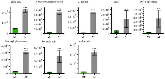 Figure 4 shows the fecal metabolites that were more abundant in AF than in MF. Citric acid, urea, N-acetyl glucosamine, butanoic acid, sorbic acid, D-(+)-cellobiose, 3-hydroxyanthranilic acid and D-pinitol, were 4.8-fold, 7.7-fold, 13.12-fold, 13.56-fold, 14.81-fold, 15.15-fold, 17.69-fold and 37.28-fold higher, respectively, in AF than in MF (Figure 4). The chemical structures of these compounds are shown in Figure S3.