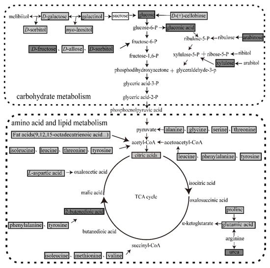 A total of 13 amino acids, 5 fatty acids, 13 sugars and 1 organic acid showing different abundance between AF and MF were mapped into an integrated metabolic pathway (Figure 5). All amino acids could be catabolized to common tricarboxylic acid cycle (TCA) intermediates such as α-ketoglutarate, succinyl-CoA, 2-butenedioic acid, acetyl-CoA and oxaloacetic acid (Figure 5). D-(+)-cellobiose, sucrose, galactinol and D-galactose could be degraded into glucose (Figure 5). D-fructose, D-allose, D-sorbitol could be transformed into fructose-6-phosphate (Figure 5). The aforementioned carbohydrates would then feed into the glycolytic pathway. Fatty acids such as 9,12,15-octadecatrienoic acid were oxidized to acetyl-CoA which feeds into the TCA cycle (Figure 5). Hence, the TCA cycle pathway is severely affected in silkworms fed artificial diet.