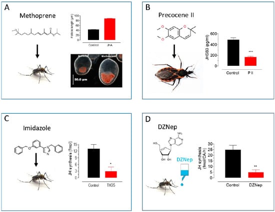 Approaches to modulate endogenous JH titers. (A) Methoprene topical application: Methoprene stimulates follicle development and lipid accumulation in Ae. aegypti females []. (B) Precocene II topical application: P II decreases JHSB3 titers in Dipetalogaster maxima []. (C) Imidazole treatment: Imidazoles inhibit JH synthesis in Ae. aegypti females []. (D) DZNep in vivo treatment: DZNep added to the sugar inhibits JH synthesis in Ae. aegypti females []. * p < 0.05, ** p < 0.01, *** p < 0.001.