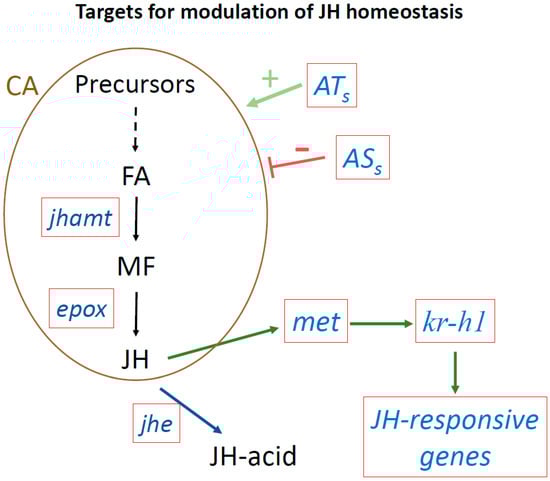 Targets to modulate JH homeostasis using next generation tools. Targeting genes playing critical roles modulating JH titers or JH signaling. Red boxes show target genes. Juvenile acid methyl transferase (jhamt) transforms farnesoic acid (FA) into methyl farneosate (MF). Epoxidase (epox) converts MF into JH. JH esterase (jhe) converts JH into JH-acid. The met gene encodes the JH receptor. Krüppel-homolog 1 (Kr-h1) is as an early inducible gene in the JH signaling pathway, that activates the transcription of many JH-inducible genes. ATs, allatotropins that stimulate JH biosynthesis; ASs, allatostatins that inhibit JH synthesis; CA, corpora allata.