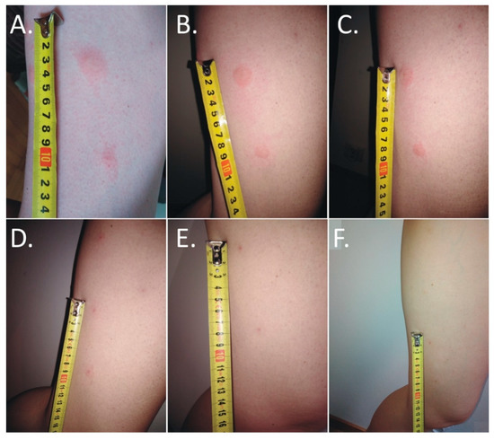 Evolution of skin lesions after deer ked (Lipoptena cervi) bites. (A,B) Multiple painful urticarial pink papules on an erythematous base on the thigh: (A) irregular one day after the bite; (B) more regular two days after the bite); (C) excoriated erythematous papules with self-limited dermatitis (three days after the bite); (D) hyperpigmented papules on an erythematous base (5 days after the bite); (E) hyperpigmented papules on an erythematous base (4 weeks after the bite); (F) residual hyperpigmented papules 6 weeks after the bite).