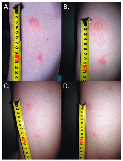 Inflammatory reaction to the deer ked (Lipoptena cervi) bite. (A) 25 mm × 15 mm erythema 17 h after the bite; (B) 50 mm × 25 mm erythema 25 h after the bite; (C) 68 mm × 30 mm erythema 40 h after the bite; (D) self-limited 50 mm × 30 mm inflammatory reaction 64 h after the bite; the black lines mark the extent of inflammatory changes.