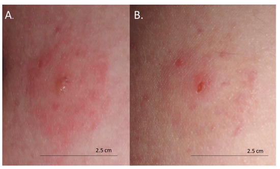 Bites from deer ked (Lipoptena cervi): (A) formation of vesicles on the skin 48 h after the bite; (B) small erosions 72 h after the bite.