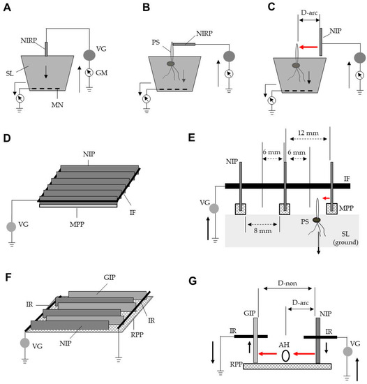 (A–C) Methods for examination of soil electric conductivity, examination of plant shoots grown in soil, and exposure of plant shoots to arc discharge, respectively. (D) Configuration of an electrostatic weed-eradicator (EWE). (E) Cross-sectional view of the EWE. (F) Configuration of an electrostatic insect-eradicator (EIE). (G) Cross-sectional view of the EIE. Solid arrows represent the movement of electricity, while red arrows show aerial movement of electricity through arc discharge. Abbreviations: NIRP, negatively charged iron rod probe; SL, soil; MN, metal net; VG, voltage generator; GM, galvanometer; PS, plant shoot; NIP, negatively charged iron plate (conductor); IF, iron frame; MPP, mortised polypropylene plate (insulator); GIP, grounded iron plate (conductor); IR, iron rod; RPP, reticulate polypropylene plate (insulator); AH, adult housefly; D-non, distance causing no arc discharge; D-arc, distance causing arc discharge.