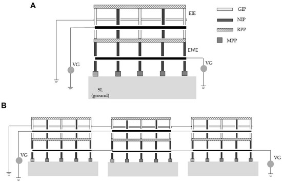 Figure 1D,E shows the configuration of the EWE, which consisted of identical iron plates, a voltage generator, and mortised polypropylene square rods (width of one side, 5 mm; length, 30 cm). The bottom sides of the iron plates were mortised with a polypropylene rod to insulate them from the soil. The plates were arrayed in parallel at a predefined interval (12 mm) and welded to an iron frame. The iron frame was linked to a voltage generator.