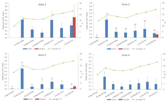 Mean numbers of daily captures of adults and nymphs of Halyomorpha halys per trap and average temperatures (°C) recorded in each area in the sampling period. Bars of adult captures labelled with the same letter are not significantly different (one-way ANOVA, Tukey’s test, p < 0.05).