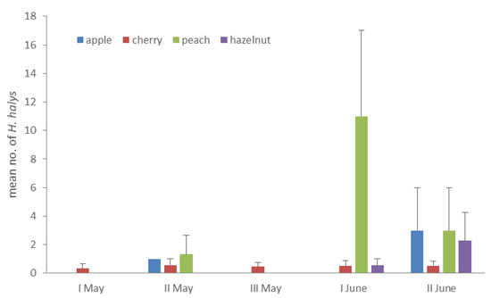 Host plants were evaluated for the presence of fruit during the sampling period. In total, 14 species were bearing fruit at different ripening stages on at least one sampling date, whereas the remaining species were present in a vegetative stage (Table 3). Independently of the period, the presence of fruit resulted a significant factor for the mean density of H. halys (mean numbers of adults per plant per sampling date) (ANOVA: F (1, 22) = 12.358, p = 0.002). Differences in abundance of H. halys between fruiting or vegetative stages were recorded in the following 10-day periods: II May (ANOVA: F (1, 24) = 6.722, p = 0.016), I June (ANOVA: F (1, 21) = 5.371, p = 0.031), and II June (ANOVA: F (1, 21) = 17.581, p < 0.0001). Among fruiting plant species, crops presenting fruit from early May to late June, i.e., apple, cherry, peach, and hazelnut, were compared for H. halys abundance. Although on cherry seasonal abundance was quite stable across the sampling period, on other crops population levels generally fluctuated (Figure 2). Nevertheless, no significant differences were found between these four crops in the mean values pooled across the sampling period I May–II June (Kruskal–Wallis: df = 3; χ2 = 3.053; p = 0.383; N = 22).