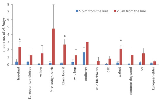 Some host plant species (no. 13) were located also in the proximity (i.e., ≤ 5 m) of the lures (Figure 3). Due to the potential interaction between the lure and the host plant, these plant species were considered separately from the same species farther away. Overall, mean values of the adults collected across the sampling period were significantly higher on all the plants located within 5 m from the lures compared to all the plants of the same species located farther from the lures (ANOVA: F (1, 28) = 18.051, p < 0.0001). Although each species nearby hosted higher values of H. halys adults compared to the same species far away, significant differences were recorded only on hazelnut (ANOVA: F (1, 11) = 6.670, p = 0.025), black locust (Robinia pseudoacacia L.) (ANOVA: F (1, 11) = 14.203, p = 0.003) and walnut (ANOVA: F (1, 11) = 17.279, p = 0.002) (Figure 3). The sampling periods (no. 7) did not affect the factor proximity/distance from the lure (ANOVA; F (6, 145) = 1.659, p = 0.135).