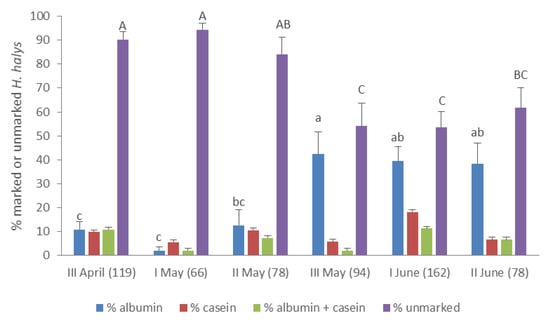 Across the sampling period, significant differences were found in the percentages of specimens unmarked and marked with albumin (ANOVA: unmarked: F (5, 108) = 7.167, p < 0.0001; albumin: F (5, 102) = 6.571, p < 0.0001), whereas no significant differences were recorded in the percentages of specimens marked with casein and with both proteins (ANOVA: casein: F (5, 108) = 2.136; p = 0.067; albumin + casein: F (5, 102) = 1.952, p = 0.092) (Figure 4).