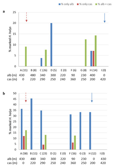 Total percentages of marked Halyomorpha halys adults collected in the sampling zones (A–H) of Area 4 from 19 April to 17 May (a) and from 18 May to 22 June (b). On the x-axes for each zone the total number of tested specimens is given in brackets. For each zone, the distance (meters) from the treatment site is also indicated either for albumin (“alb”) or casein (“cas”). Arrows designate the zones in which treatments with casein (dashed dark red arrow) and albumin (blue arrow) were applied.