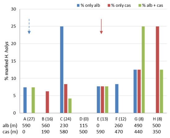 Total percentages of marked Halyomorpha halys adults collected in the sampling zones (A–H) of Area 2 from 26 April to 5 June. On the x-axis for each zone the total number of tested specimens is given in brackets. For each zone, the distance (meters) from the treatment site is also indicated either for albumin (“alb”) or casein (“cas”). Arrows designate the zones in which treatments with casein (dashed dark red arrow) and albumin (blue arrow) were applied.