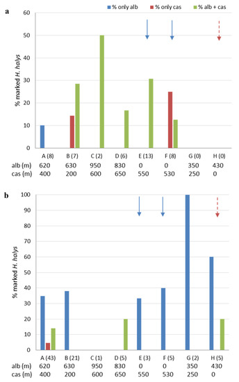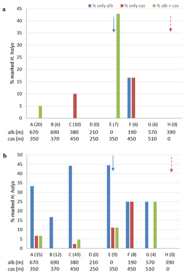 Total percentages of marked Halyomorpha halys adults collected in the sampling zones (A–H) of Area 3 from 5 April to 27 April (a) and from 28 April to 30 May (b). On the x-axes for each zone the total number of tested specimens is given in brackets. For each zone, the distance (meters) from the treatment site is also indicated either for albumin (“alb”) or casein (“cas”). Arrows designate the zones in which treatments with casein (dashed dark red arrow) and albumin (blue arrow) were applied.