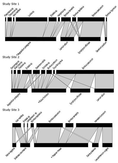 The network in Study Site 1 included four flower species (i.e., Symphytum officinale, Lamium album, Aegopodium podagraria, and Geranium pusillum). In Study Site 2, the network also included four flower species (i.e., Symphytum officinale, Lamium album, Aegopodium podagraria, and Rubus fruticosus). In Study Site 3, the network consisted of five flower species (Malva neglecta, Scabiosa columbaria, Papaver rhoeas, Salvia pratensis, and Leucanthemum vulgare). All plants were native to Belgium (see Figure S2 for further information on plant species) [,].