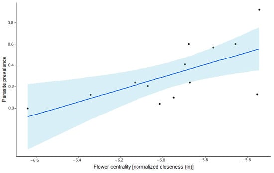 Results of the generalized linear mixed Model 3 (GLMM 3): interaction effect of flower centrality (ln-transformed normalized closeness; x-axis) and parasite prevalence (y-axis), i.e., Neogregarinorida and Trypanosomatidae taken together (presence/absence data). Parasite prevalence and centrality are plotted (black dots) for each analyzed plant species in each study site. Shaded blue shows the 95% confidence interval.