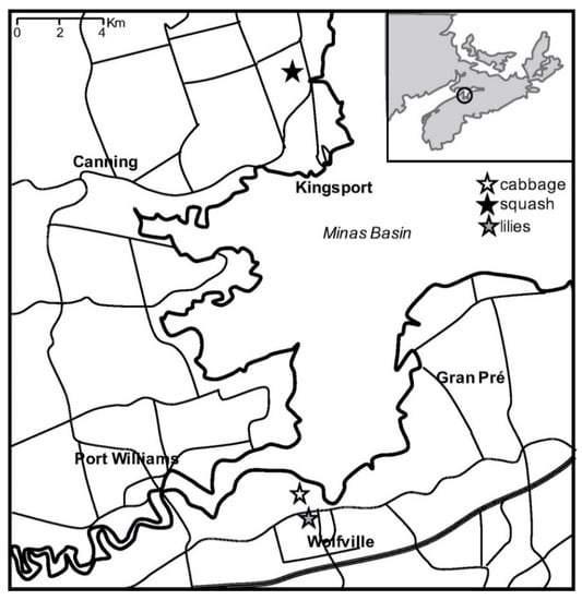 Squash plot—Acorn squash seeds (C. pepo) were planted the first week of June 2018 by machine in rows 1.5–2.0 m apart, with an in-row spacing of 35–46 cm. One section of the squash field, located in Canning (45°10′20″ N 64°21′42″ W; NS, Canada), was selected as the experimental plot (50 × 3 m, located on the north-west corner adjacent to the border) (Figure 2) and not subjected to conventional insecticide and herbicide spraying. The rest of the field was treated twice with Admire® (Bayer, Mississauga, ON, Canada) and Poast® Ultra (BASF, Saint-Léonard, QC, Canada). The plot was organized into blocks (5 × 1 m) for a total of 30 blocks (3 columns × 10 rows). The column adjacent to the pesticide treated section was considered as buffer line and not included in the analysis because of possible drift during pesticide application. There were three to four replicates of each treatment (containing a maximum of 7 plants each), arranged in a randomized complete block design. Every week, pest damage was visually evaluated following the same approach described for cabbage plants, and reported as a percentage. Manual weed removal was carried out weekly. In September 2018, squash fruits were collected from the experimental plot, washed with water to remove soil and treatment residuals to assess fresh weight and diameter. Squash material was chopped and transferred into paper bags and oven-dried at 70 °C for 48–72 h. The dry weight of each squash was then recorded. From each squash, seeds were collected and air-dried at room temperature for about 2 weeks, and the dry weight of 10 seeds was recorded. Sampled seeds were then stored at −20 °C in plastic bags for further elemental analyses [26].