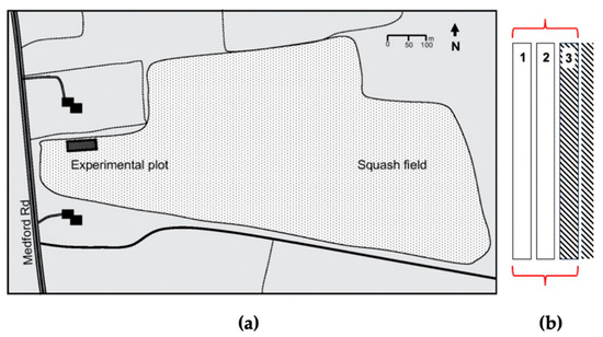 (a) Overview of buttercup squash field in Canning (NS, Canada). (b) Section of the rows: columns 1 and 2 were part of the trial, while column 3 (dashed lines, confining with the pesticide treated section) was considered as the buffer line and not included in the analysis.