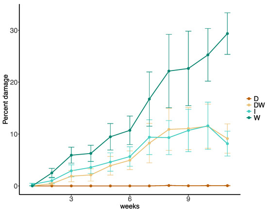 Percentage of herbivory damage (±SEM) caused by lily leaf beetles (L. lilii) at different time points on lily plants at different treatments (W = control; D = dry dust; DW = dust with water; I = Insectigone®).