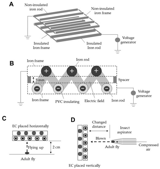 Figure 1A shows the structure of the EC. The EC consisted of round iron rods and a direct current (DC) voltage generator (Max Electronics, Tokyo, Japan). The iron rods (length, 30 or 100 cm; diameter, 2 mm) were arrayed in parallel at fixed intervals and welded to a square iron frame (frame plate: thickness, 1 mm; height, 4 mm; length of square, 30 cm). The frame-fixed iron rods were coated with a polyvinyl chloride (PVC) resin (coating thickness, 1 mm; resistivity, 109 Ω cm) for insulation (Sonoda Seisakusho, Osaka, Japan) and linked to a voltage generator to supply a negative charge to the insulated iron rods (IRs). Another set of frame-fixed iron rods (length, 30 cm; diameter, 4 mm), which were not insulated, was linked to a grounded line. The non-insulated grounded iron rods (NGRs) were used as an opposite pole. The IR and NGR layers were arranged such that the two layers were spaced 5 mm apart and offset from each other (Figure 1B). The negative charge of the IRs polarised the NGRs positively via electrostatic induction [23], and an electric field formed between the opposite charges of the IRs and NGRs. Insects entering this electric field were attracted to the negatively charged IRs as a result of the positive electrification of the insect body [24,25,26,27].
