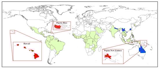 World distribution of the coffee berry borer (CBB). Countries with CBB prior to 2007 are highlighted in green. Island regions that were recently invaded are highlighted in red from left to right; Hawaii (2010), Puerto Rico (2007), and Papua New Guinea (2018). The only countries without CBB (Nepal, China, and Australia) are highlighted in blue.