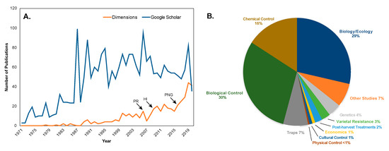 Number of publications per year on Hypothenemus hampei (CBB) over the last 50 years as reported in the Dimensions and Google Scholar databases (A). The arrows indicate when CBB was introduced to Puerto Rico (PR), Hawaii (HI), and Papua New Guinea (PNG). Over the last 10 years (2011–2020), the majority of publications have been focused on describing the basic biology and ecology of CBB, and investigating biological and chemical controls (B).