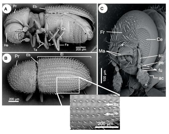 External anatomy of an adult of Hypothenemus hampei. (A) Lateral and inferior view showing pronotum (Pr), elytral base (Eb), head (He), legs with third coxa (Cx), femur (Fe), tibia (Ti), and tarsus (Ta). (B) Top view; detail (box) of the elytron (El) showing strial setae (Ss) and interstrial bristles (Ib). (C) Frons (Fr), mandibles (M), compound eye (Ce), antenna club (Ac), segmented funicle (Sf), pedicel (Pe), scapus or scape (Sc). Nomenclature according to Hulcr et al. [20] and Vega et al. [5].