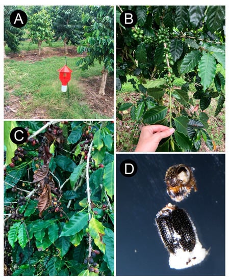 - Aristizábal, L.F.; Shriner, S.; Hollingsworth, R.; Mascarin, G.M.; Chaves, B.; Matsumoto, T.; Arthurs, S.P. Field sampling strategies for coffee berry borer (Coleoptera: Curculionidae: Scolytinae) infesting berries in coffee farms in Hawaii. Int. J. Trop. Insect Sci. 2018, 38, 418–426. [Google Scholar] [CrossRef]