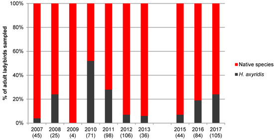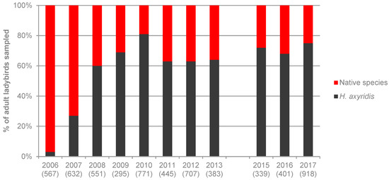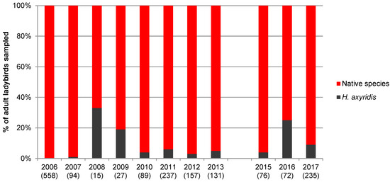 Percentage of Harmonia axyridis and native species at the 15 broadleaved hedges from 2006 to 2017. Numbers between parentheses indicate the number of adult ladybirds collected.