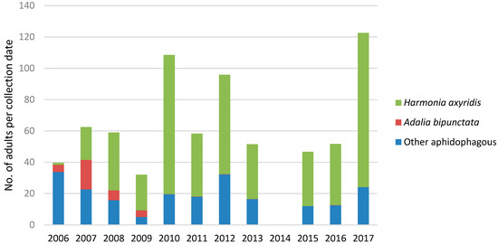 - Bahlai, C.A.; Colunga-Garcia, M.; Gage, S.H.; Landis, D.A. Long-term functional dynamics of an aphidophagous coccinellid community remain unchanged despite repeated invasions. PLoS ONE 2013, 8, e83407. [Google Scholar] [CrossRef]