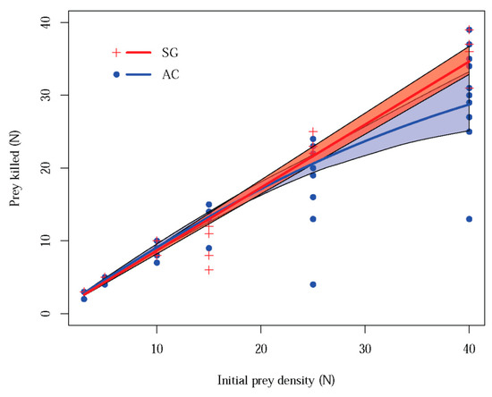 where for both models Ne represents the number of prey killed, N0 is the initial prey density, a is the attack rate (searching efficiency per time), Th is the handling time, and T the time of the experiment. The fact that Ne appears in both sides of the Equation (2) is due to lacking of prey replacement during the experiment and is solved using the Lambert’s transcendental equation [37]. In the case of a type-II functional response, the maximum attack rate (i.e., the maximum number of prey that can be attacked by the predator during T) was calculated as a point estimator as T/Th. The functional response parameters, attack rate, and handling time, were estimated using the frair_fit function. After sketching the curves, the 95% confidence interval for each one was generated by bootstrapping (999 replicates) using the frair_boot and drawpoly functions.