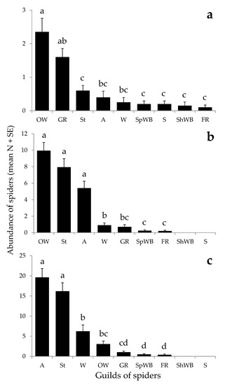 Abundance of guilds of spiders found in the studied olive groves at three sampling periods: (a) appearance of foams (P1), (b) development of nymphs (P2), and (c) emergence of adults of Philaenus spumarius (P3). Different letters above bars indicate statistically significant differences (p < 0.05). A: Ambushers; St: Stalkers; W: Wandering sheet/tangle weavers; OW: Orb-weavers; GR: Ground runners; SpWB: Space web builders; FR: Foliage runners; ShWB: Sheet web builders; S: Specialists. Note that scales differ on y axes.