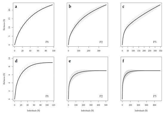 The individual-based accumulation curves were far from reaching a plateau in the case of species for each sampling period (Figure 3a–c), whereas a clear asymptote was reached for functional groups at approximately eight, seven, and seven guilds for P1, P2, and P3, respectively (Figure 3d–f).