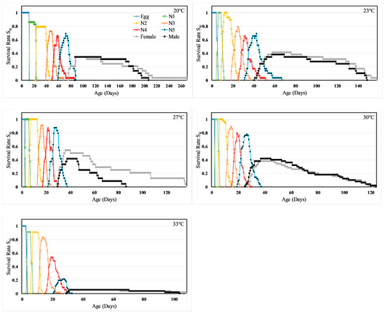 The cohort-specific egg-to-adult survival rates increased gradually as temperature increased above 15 °C, peaked at 27 °C (96%) and declined thereafter (Table 1). Owing to the variable developmental rates among individuals, there was a significant overlap in age-stage specific survival rates (Sxj) (Figure 1; also see, Supplementary Table S1). Egg-to-adult survival rates were not statistically different (p > 0.05) at 15 °C (0%) and 36 °C (2%), at 17 °C (17%) and 33 °C (11%), as well as at 23, 25 and 27 °C. Stage-specific survival rates for the egg and instars 1–2 were lowest at the extreme low (15 °C) and the extreme high temperatures (36 °C), and peaked to near 100% at intermediate temperatures between 20 and 30 °C. For late instars, survival was very high at low to intermediate temperatures (20–30 °C), but declined abruptly to experience the highest mortality at the extreme temperatures of 33–36 °C.