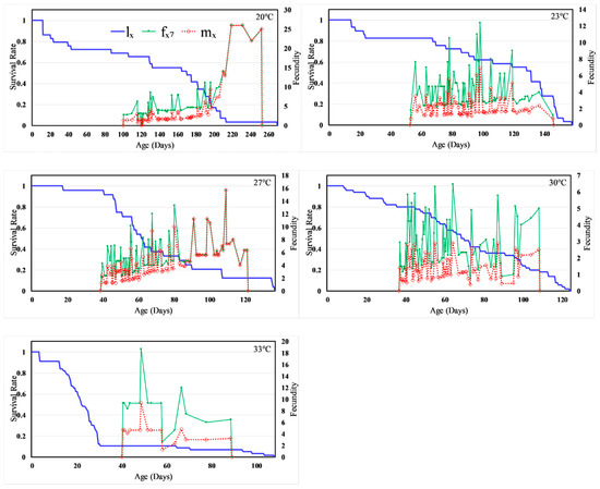 Temperature dependent age-specific survival rate (lx), female age-stage-specific fecundity (), and age-specific fecundity (mx) of H. halys.