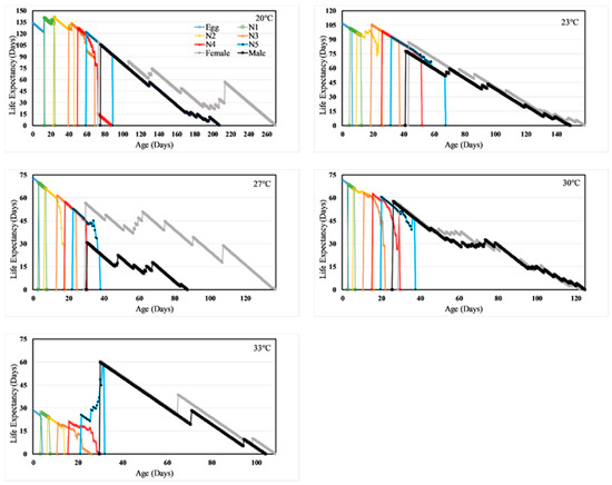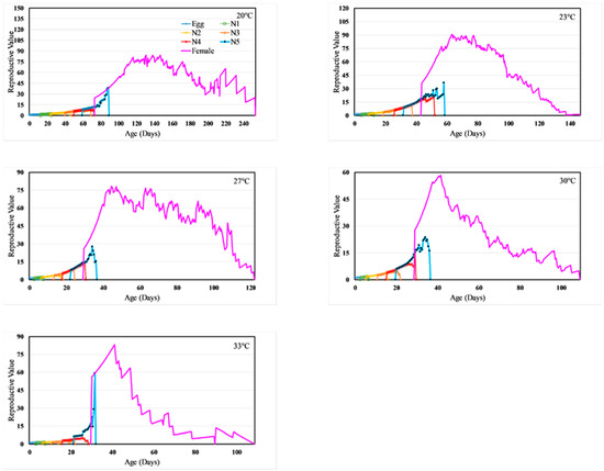 Age-stage, two-sex life tables also provided estimates of the age-stage specific life expectancy (exj; Figure 3) and the reproductive value (vxj, Figure 4). Explicitly, the life expectancy of a newly eclosed individual at 20, 23, 27, 30, and 33 °C is 134, 106, 73, 72 and 28 days, respectively (Figure 3). A female of age 76 days at 20 °C and age 38 days at 27 °C will be able to live for another three months, while a female of age 38 days at 33 °C will live only for about a month, respectively (Figure 3). The reproductive value for a new egg (v01) is the finite rate of increase (λ) (Figure 4 and Table 3). For instance, the reproductive value for a new egg at 27 °C is 1.092. The peak reproduction occurred at 106–181, 52–97, 39–80, 35–45, and 32–48 days at 20, 23, 27, 30, and 33 °C respectively, and these days represented the age at which females in respective treatment contributed the maximum to future population.