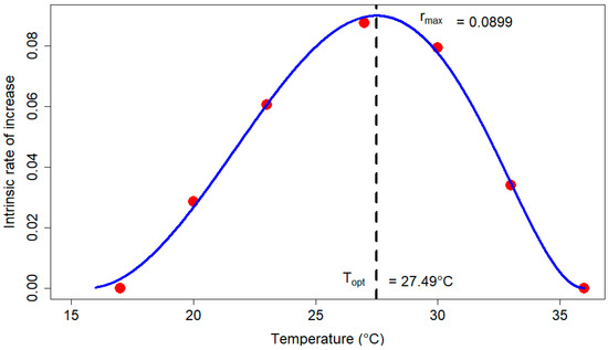 We also modeled the effect of temperature on intrinsic rate of increase estimated via age-stage two-sex life table analysis. Currently there exists no extensions of reaction rate theory that incorporate the kinetics of several major enzymes that each drive distinct fitness components such as survival, reproduction and development [58], but empirical and biophysical models describing the effect of temperature on developmental rate have been used previously to describe the relationship between temperature and [59,60] in insect species. Accordingly, we fitted all the models included in devRate package [61] and the thermodynamic Sharpe–Schoolfield–Ikemoto model of the OPTIMSSI package [62] in R freeware [63], to explain the temperature dependency of . The model with lowest value for Akaike Information Criterion (AIC) was chosen as the best fit model [64]. The temperature corresponding to maximum point of the fitted regression curve for the best model represented the optimal temperature for .