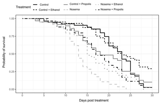 Survival of caged and experimentally treated honey bees (Apis mellifera): Control, Control + Ethanol, Control + Propolis, Nosema, Nosema + Ethanol and Nosema + Propolis.