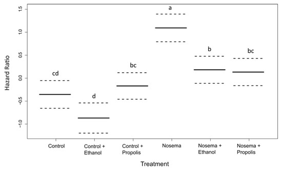 Instantaneous risk of death (hazard ratio, ± 95% CI) for adult honey bees (Apis mellifera) in each experimental treatment compared with the model average of 0. Different letters correspond to significant differences between treatments at p < 0.05 (coxme and post-hoc pairwise contrasts adjusted for multiple comparisons with the Benjamini-Hochberg method to control the false discovery rate).