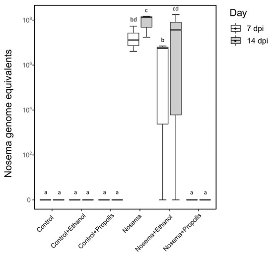 Nosema ceranae genome equivalents per honey bee (Apis mellifera) in treatments: Control, Control + Ethanol, Control + Propolis, Nosema, Nosema + Ethanol, and Nosema + Propolis at 7 and 14 days post experimental infection (dpi). Different letters correspond to significant differences between treatments at p < 0.05 (LMM and post-hoc pairwise contrasts adjusted for multiple comparisons with the Benjamini-Hochberg method to control the false discovery rate).