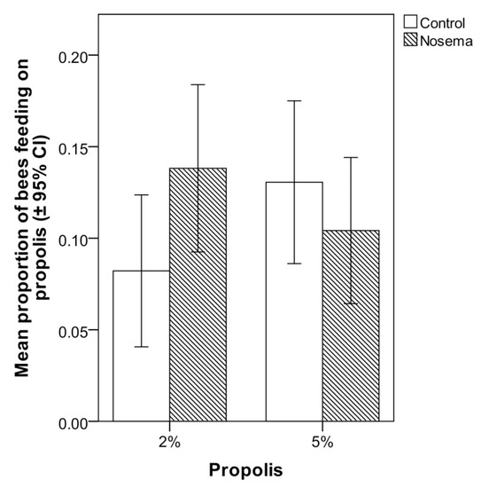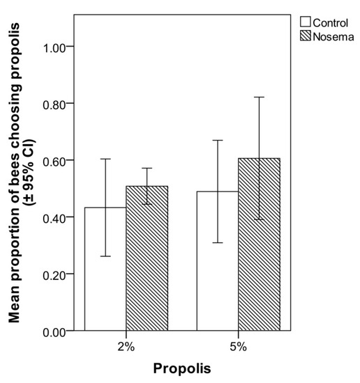 Mean proportion (± 95% CI) of honey bees (Apis mellifera) in Nosema ceranae-infected and control groups that chose candy with 2% or 5% propolis in comparison with candy without propolis in the choice test; differences between treatments were not significant (GLMM, p > 0.05).