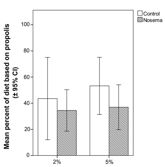 Percentage (± 95% CI) of candy with 2% or 5% propolis in the total diet consumed in Nosema ceranae-infected and control honey bees (Apis mellifera); differences between treatments were not significant (GLM, p > 0.05).